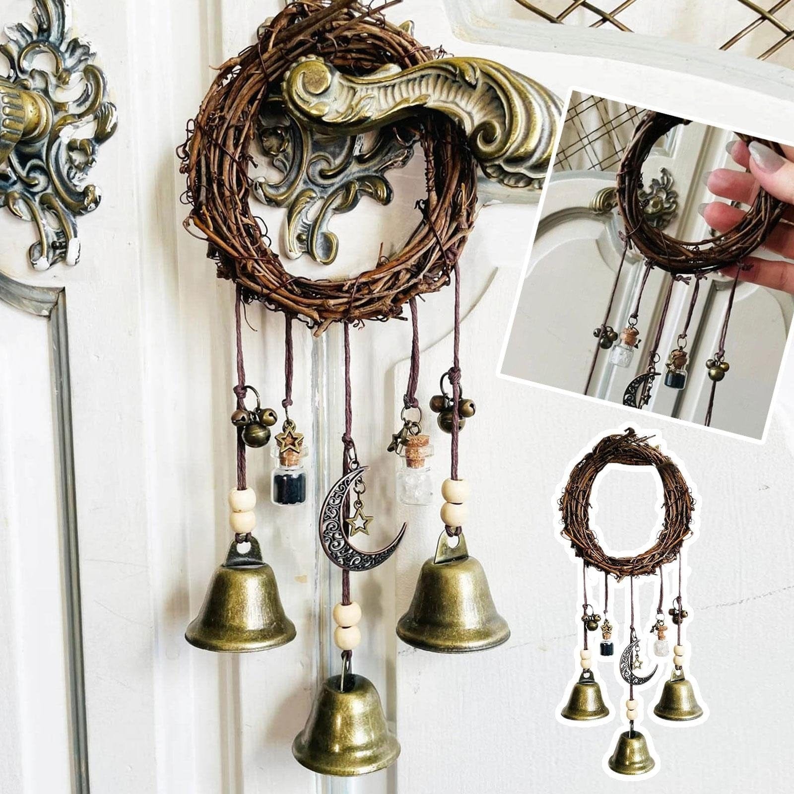 🔔Each set of these enchanting bells begins with a hand-woven natural vine wreath. symbolizing the eternal cycle of life and the binding energy of protection. From this rustic embrace hang three genuine brass bells. their gentle chimes believed to ward off negative energies and attract good fortune.